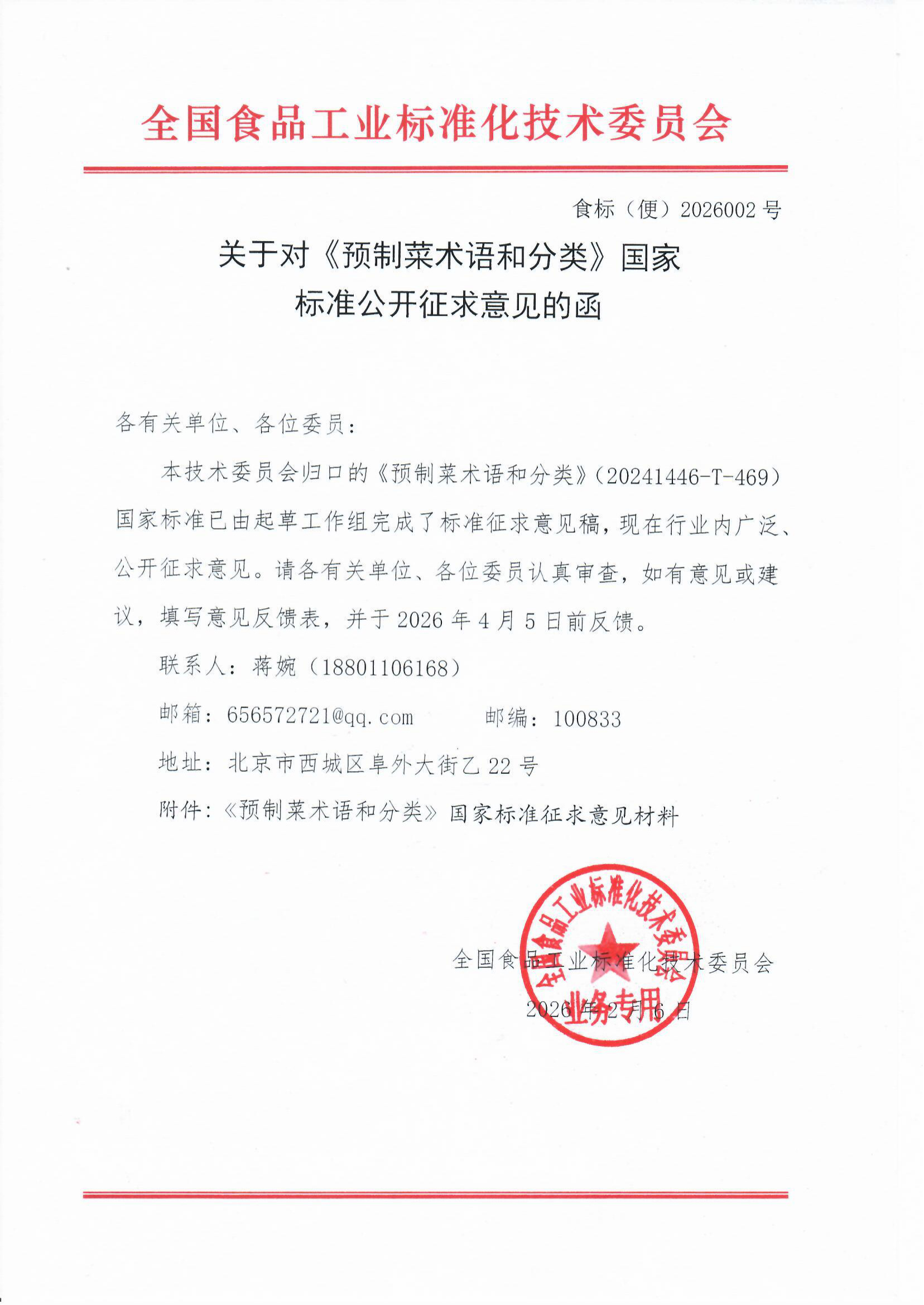 关于对《预制菜术语和分类》国家标准公开征求意见的函 食标(便)2026002号